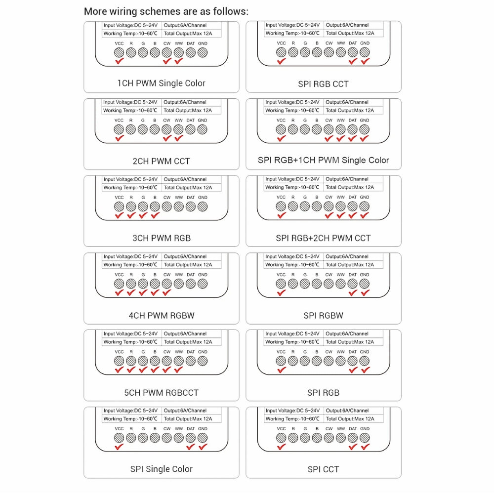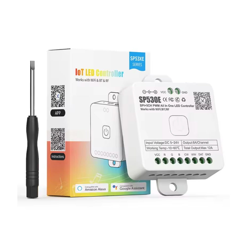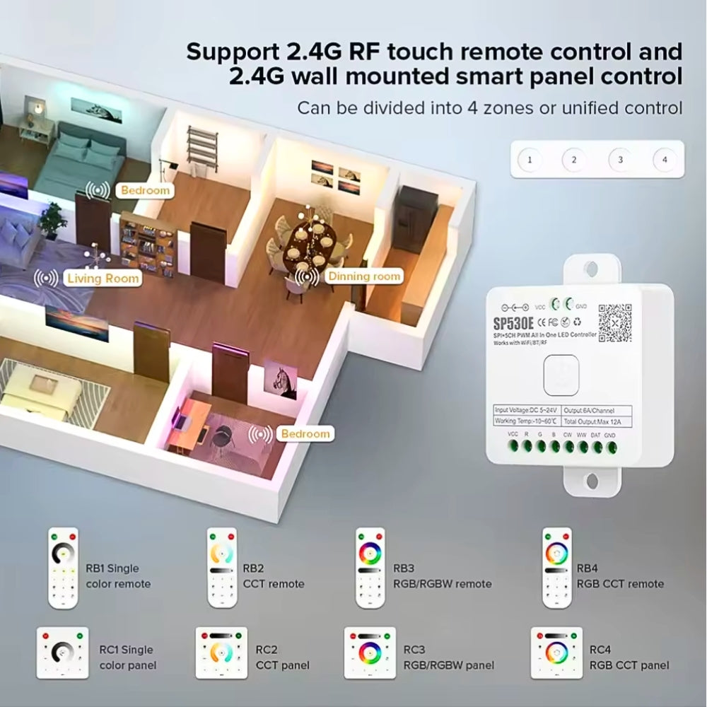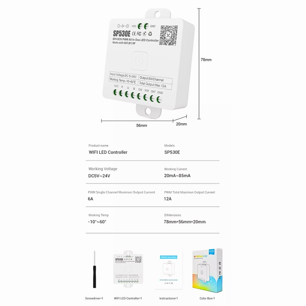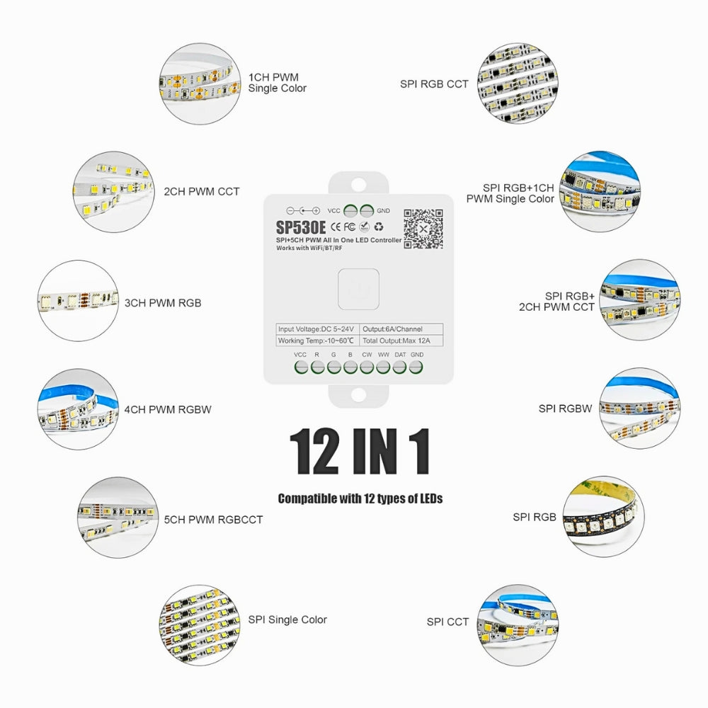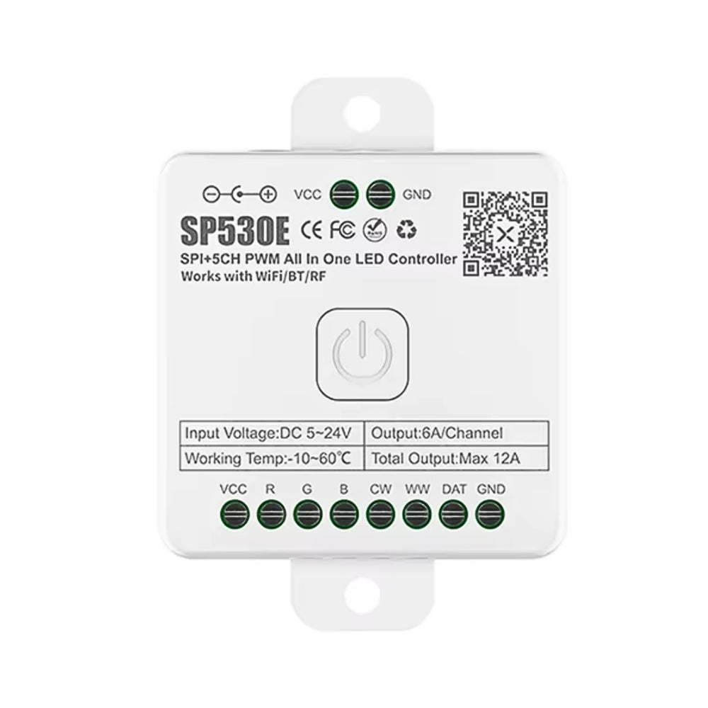 The SP530E PWM All-in-One LED Controller is a versatile device designed to work with up to twelve types of LED strips, including PWM, addressable, and combined Addressable+PWM LEDs. It supports 1/2/3/4/5CH W, CCT, RGB, RGBW, and RGBCCT configurations, making it ideal for both decorative and professional installations.