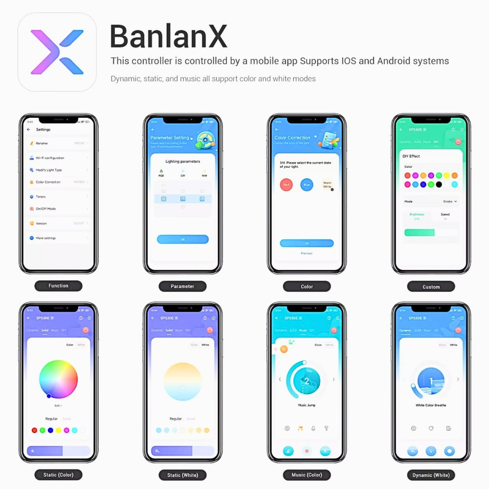 Control is simple and flexible with WiFi, Bluetooth, and RF connectivity. The controller works with the BanlanX app for iOS and Android, and is also compatible with 2.4G wireless remotes and 86-type touch panels. It can be set up for zone control across four zones or unified control, and also supports voice assistants such as Alexa and Google Home for hands-free operation.