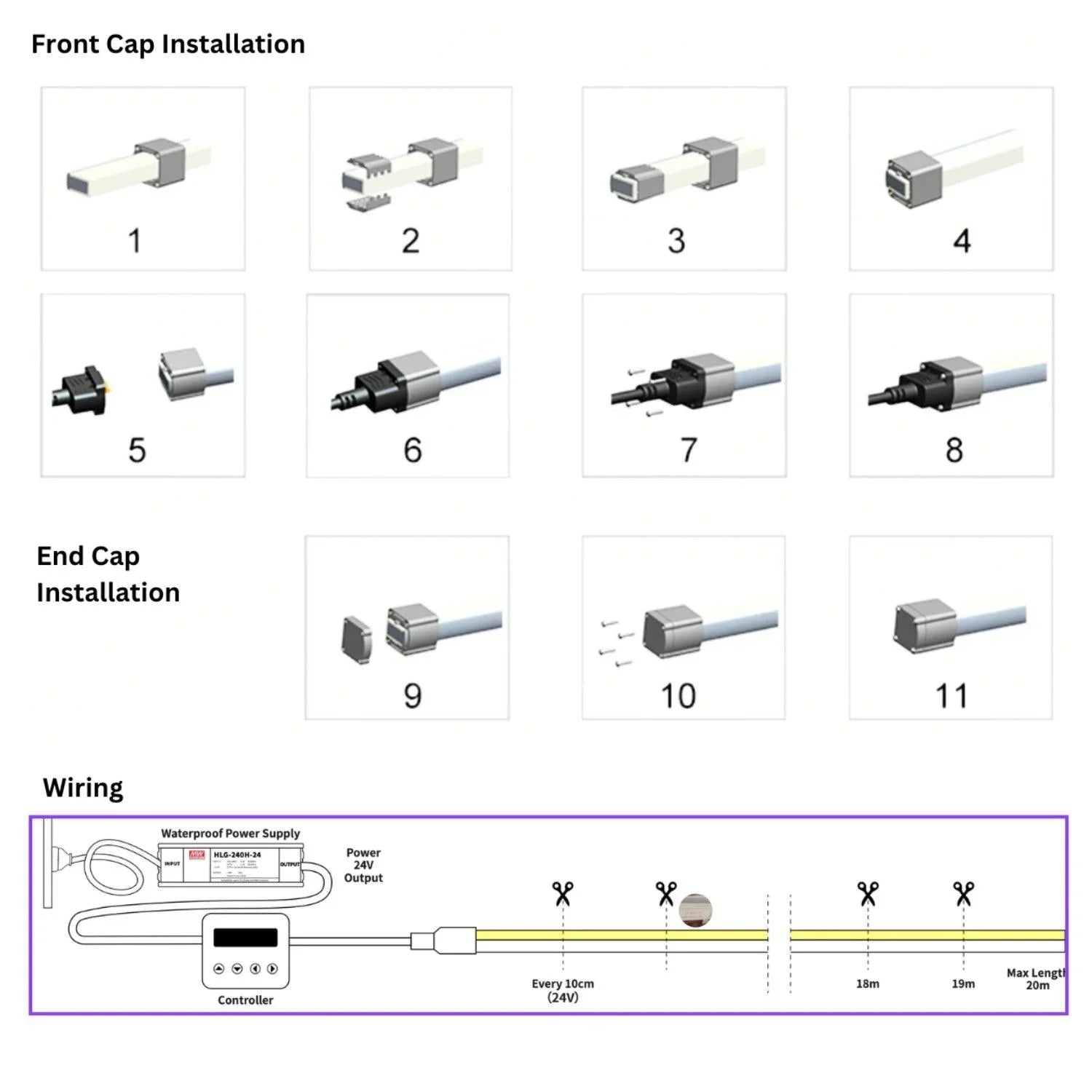 To power more than 20 metre you would have to feed both the ends of the neon flex. Up to 20 metre you can power it from one end. If the total length is more than 20 metre then you need to power the led neon flex from both the ends and you are going to need another End Cap with wire to power the neon flex from both ends to avoid voltage drop.