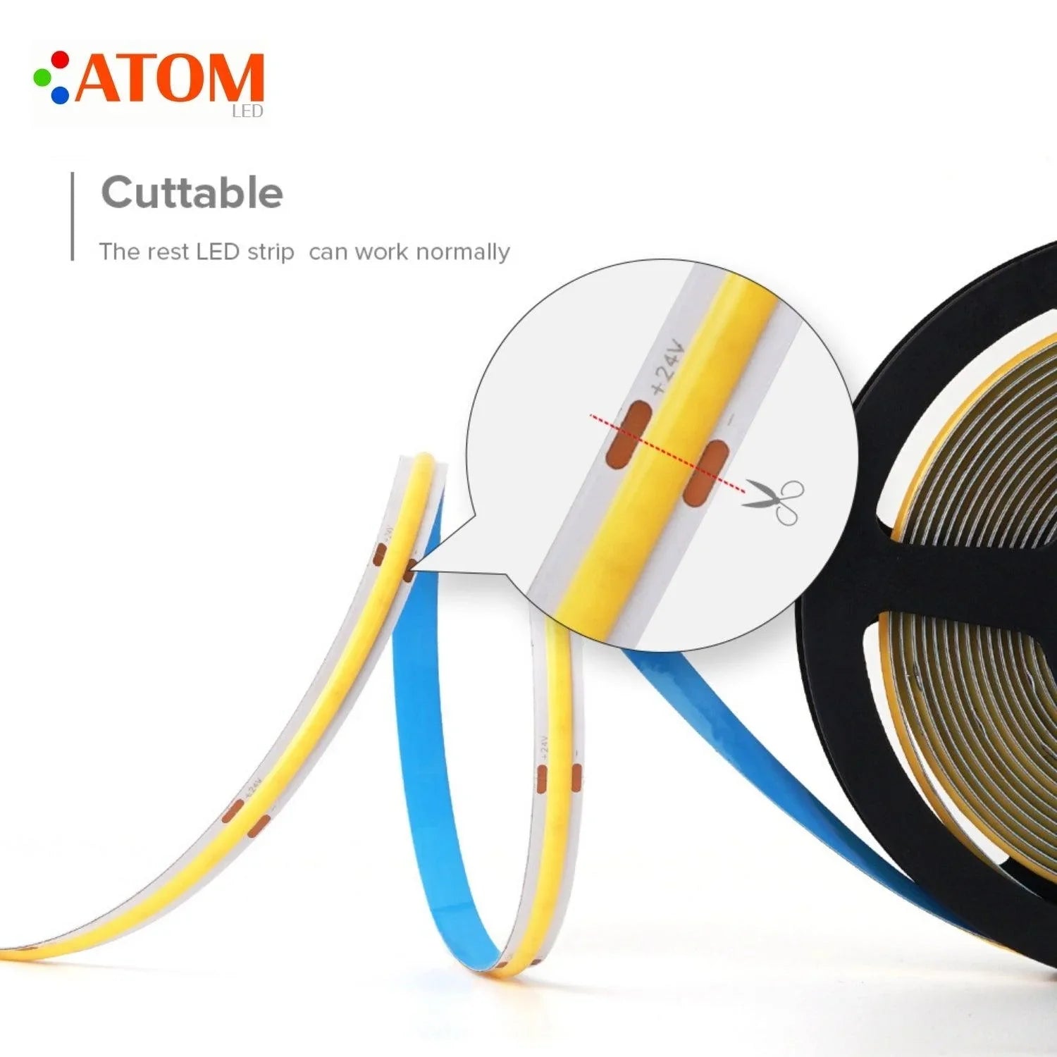 This COB (Chip on board) LED strip is a flexible LED strip with no dotting. This is especially useful if the LED strip is going to be visible or is diffused by a clear cover. LED Strip lighting is easily installed into panels or trays just by bending/folding the strip without the need for connections or soldering.