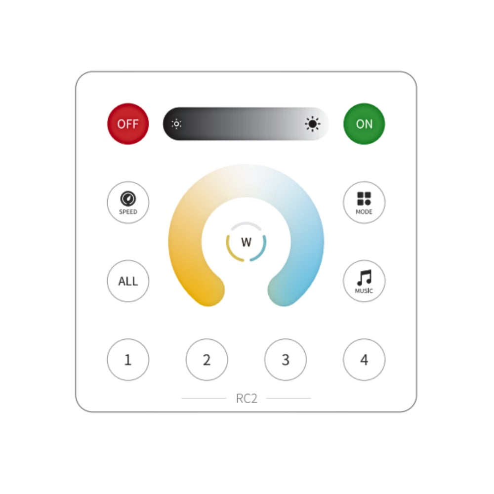 The RC2 features a sensitive capacitive touch brightness ring for precise adjustment, along with quick-select brightness buttons at 25%, 50%, 75%, and 100%. Powered by a 3V CR2032 battery, it provides reliable low-voltage operation, making it a sleek and convenient solution for flexible CCT LED strip lighting control.