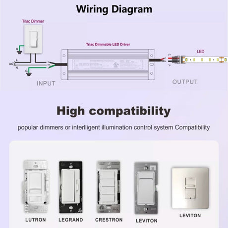 - 24V Triac Dimmable Driver: The most widely used voltage for LED strip lighting. Compatible with the broadest range of 24V LED strips, controllers and accessories. Ideal for residential, hospitality and commercial installations with standard run lengths.