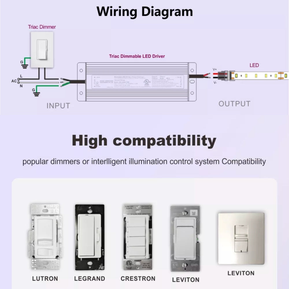 Engineered for wide compatibility, the driver integrates seamlessly with major dimmer brands and lighting control systems, including Lutron, Legrand, Crestron and Leviton. It delivers smooth 0–100% flicker free dimming, making it ideal for large residential, commercial and architectural LED strip lighting projects.
