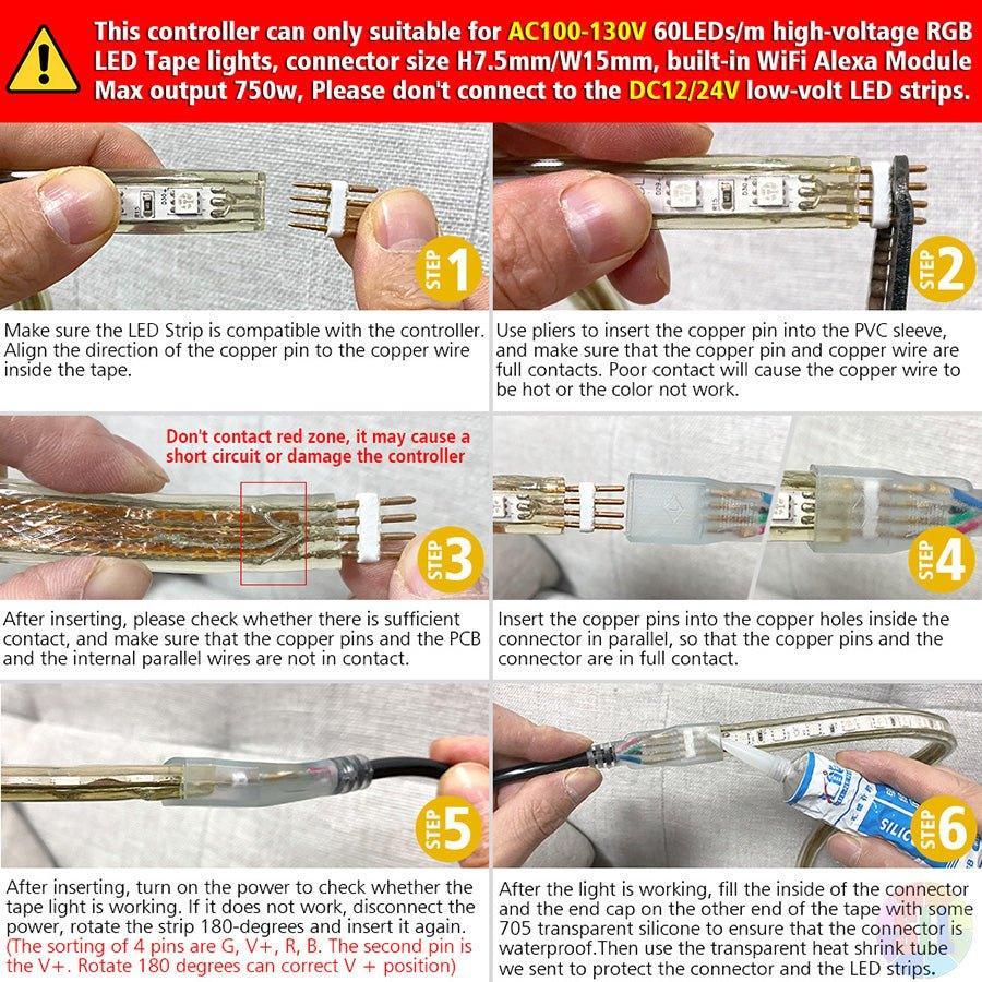 Please note that any amendments done to the lights voids the warranty on the product, this also includes taking the plug of the AC 220V 240V strip or neon light.
